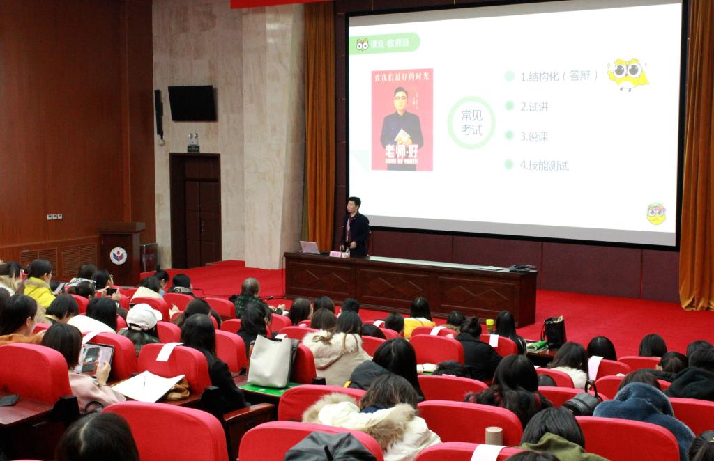 报告会从考情、学习、准备三个方面对教师招聘考试做了详细分析。在考情方面,建议同学们一是要明确要考地区采取的是统考还是非统考;二是要了解统考和非统考的具体考试内容和题型;三是要了解山东省2019年的高层次人才引进以及新型考试方法。在学习方面,两位老师从三种常见考试类型——结构化、说课、试讲入手,向同学们详细介绍了应对的方法和技巧。强调结构化题型要注意逻辑、理清思路,试讲时要明确问题设置的层次性,说课时要注重模板、过渡性语言的运用。两位老师在介绍方法的同时还结合考试真题进行了具体分析,帮助同学们加深理解。在准备方面,两位老师对笔试和面试的规划以及阶段安排进行了简单的讲解。笔试备考要从基础知识、题目巩固和套题冲刺三个板块进行至少六个月的准备,面试备考要从结构化题目练习、试讲模拟和说课模拟三个板块进行准备。最后,两位老师建议同学们:要尽早开始准备在整个教师招聘考试中非常重要的面试,要练语言、语调及抑扬顿挫的语气,要加深对新课改和新课标的理解,使其更好地运用在试讲和说课中。报告会在热烈的掌声中圆满结束。
