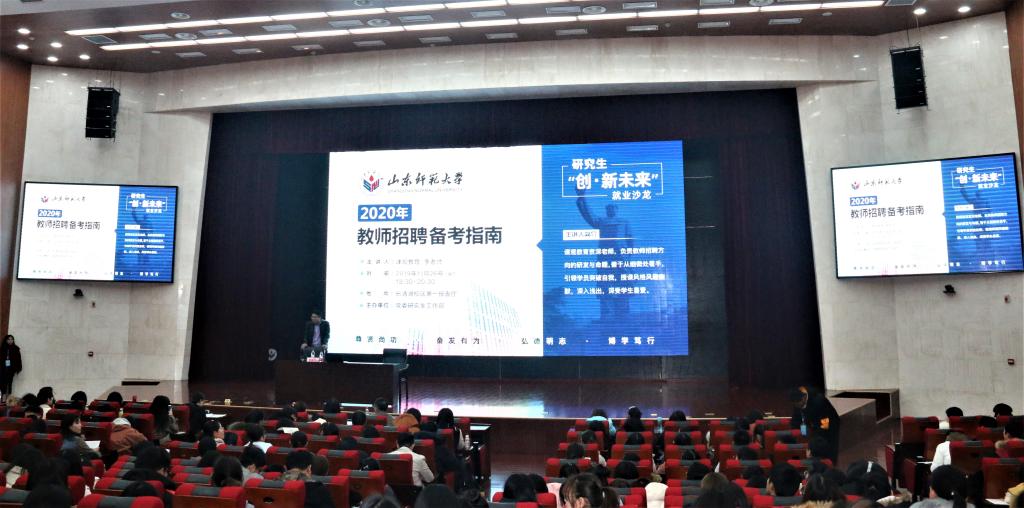 为促进研究生高质量就业,激发研究生创新实践活力,党委研究生工作部本学期正式启动研究生“创·新未来”就业沙龙活动。沙龙启动仪式暨首场活动以“2020年教师招聘备考指南”为主题,联合招生就业处邀请课观教育资深导师李雪飞和顾存金,分别于11月26日在长清湖校区第一报告厅,11月27日在千佛山校区教学三楼报告厅举行专题报告会。研工部就业科科长高鹏鹏,两校区700余名研究生、本科生到场聆听了报告。