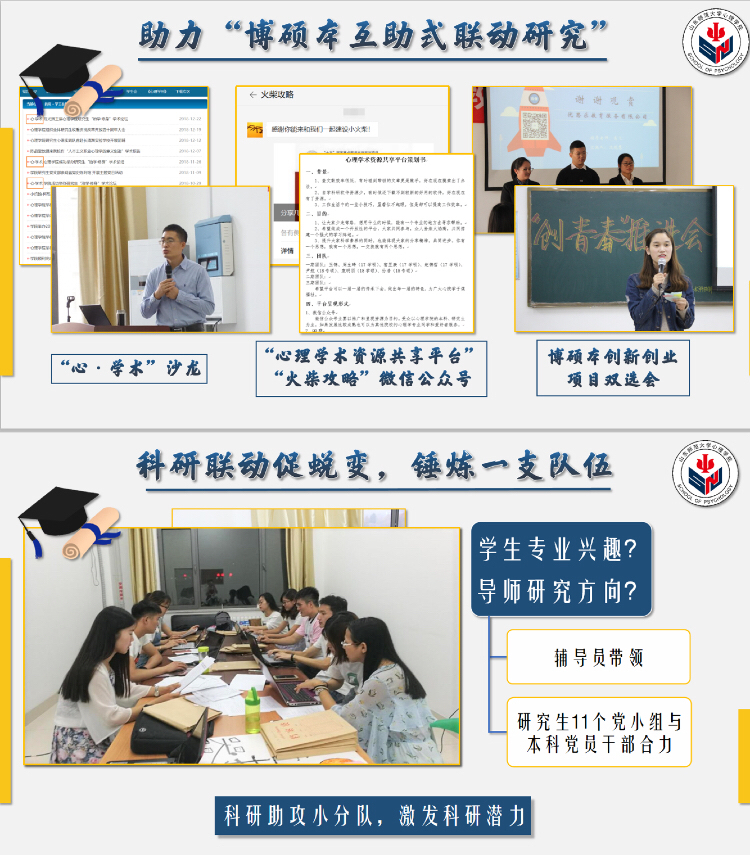 科研联动促蜕变,锤炼一支队伍。在科研攻坚战的路上,小分队实现了蜕变。研究生党员干部成为生力军。通过打造“心·学术”沙龙,“心理学术资源共享平台”,“博硕本创新双选会” ,“研究生担任本科辅导员助理”等,实现“互助式联动研究”。“全员导师制”下,面对专业探索迷茫期的本科生,研究生辅导员带领研究生11个党小组进行对接,帮助他们尽快找到适合的课题组,同时博硕生的科研开展有了得力助手,本科生的科研潜力不断被激发。前文提到的发表两篇C刊的本科女孩就有小分队的功劳。一篇文章未出前,她心情浮躁,辅导员多次找来谈话,状态虽有所调整,但问题没有彻底解决,于是给她找到一位获国奖的研究生党员干部,对她进行论文上的“一对一帮扶”。最终“两篇C刊均被录用。而这名硕士,在帮助他人的同时,也收获推免山大博士成功的喜讯。