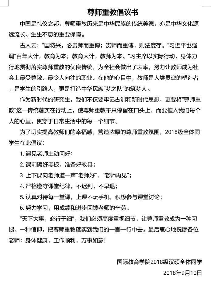 秋风飒爽,金阳怡悦,在这样一个清朗的时节里国际教育学院2018级全体研究生于9月10日开展了以“尊师重教树文风”为主题的教师节活动。