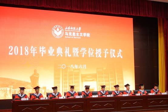 在庄严的国歌声中,毕业典礼拉开序幕。李效宽与于晓明宣读《马克思主义学院2018届优秀毕业研究生名单》和《马克思主义学院2018届优秀本科毕业生名单》,许士国与刘浩宣读《关于授予马克思主义学院孙天蕾等93人博士、硕士学位的决定》和《关于授予马克思主义学院马璐等293人学士学位的决定》。