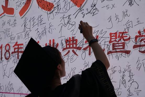 典礼开始前,全体毕业生在亲友的注视下踏着红毯,走过“致青春致大学致未来”签名墙,陆续进入会场。大屏幕上,沙画视频里的一幕幕光影匆匆流过,毕业MV留下的是一段段关于“哭过”、“笑过”、“恋过”的马院学子的青葱记忆。