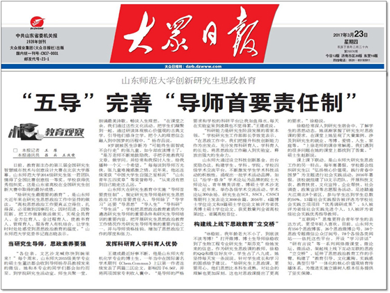 山东师大在研究生教育中实施“导师首要责任制”,规定研究生导师是研究生思想政治工作的首要责任人,导师除了“导学习”还要“导思想”“导人生”“导科研”“导生活”。学校把思想政治教育素质作为遴选研究生导师的重要条件和研究生导师培训的重要内容,把开展研究生思想政治教育工作情况作为研究生导师考核的重要内容之一,并与导师资格挂钩,增加了思想政治工作的厚度和张力。