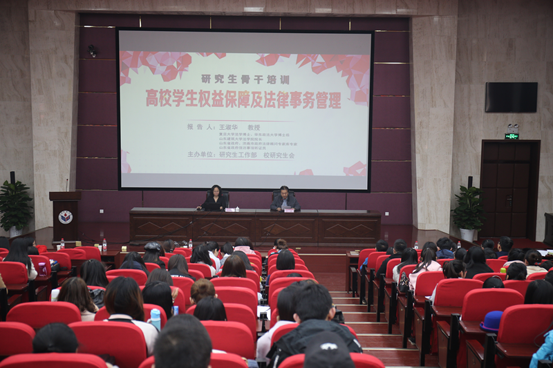 3月17日下午,应校党委研究生工作部邀请,山东建筑大学法学院院长王淑华教授在千佛山校区教学三楼报告厅作了题为《高校学生权益保障及法律事务管理》的精彩学术报告。报告会由校党委研究生工作部副部长于铁主持,各研究生培养单位的研究生辅导员和研究生骨干代表200余人共同聆听了报告。