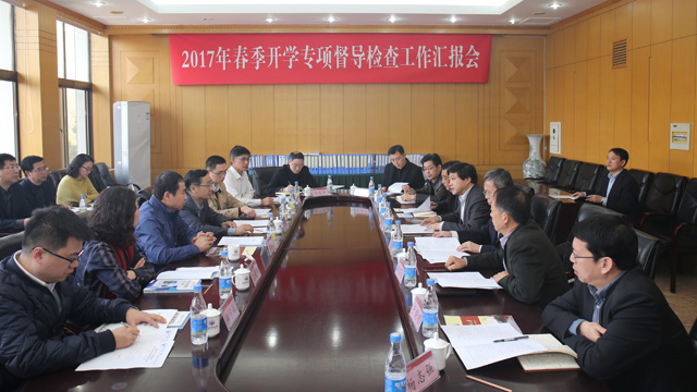 督导组进校后,通过座谈交流、听取汇报、查阅资料、实地查看等形式,对我校开学有关工作进行了全面检查和督导。座谈会上,校长唐波代表学校向督导组简要介绍了学校办学历史和改革发展情况,并就开学条件保障、学生资助、教材管理、实习实训、经费保障、网络运行管理、校舍安全管理、饮食安全管理、校车安全管理、开学主题教育活动等方面情况向督导组作了详细汇报。他表示,多年来学校始终高度重视并一贯坚持超前谋划、提前着手开学准备工作。目前,经过周密部署、细致准备和严格督促检查,学校教学、科研、管理等工作都已经顺利步入正常轨道,全校师生正以全新姿态推进综合改革和“双一流”创建工作,争取以优异成绩迎接党的“十九大”胜利召开。