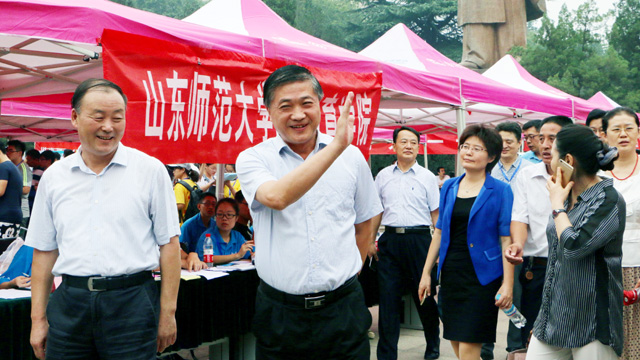 迎新当天,学校领导商志晓、唐波、向来生、王焕斌、王少华、张文新分别来到千佛山校区和长清湖校区迎新现场,看望前来报到的新生和家长,亲切慰问奋战在迎新一线的工作人员。学校领导在迎新报道点认真听取了各部门迎新工作汇报、观看了各单位制作的迎新宣传展板、参与了各学院组织的特色迎新活动,详细了解迎新工作流程和新生报到情况,与广大工作人员、志愿者以及2016级新同学亲切交谈、合影留念,为他们送上诚挚问候。