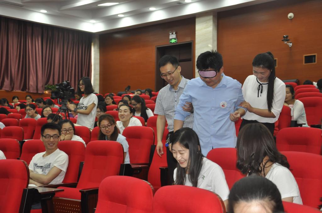 在报告会最后,佘瑞琴邀请研工部老师和现场志愿者进行互动游戏——通过蒙住眼睛独立上下台阶及在别人搀扶下上下台阶的方式,去感受心理帮助带来的安全感和引导作用,并以此游戏向在场的研究生志愿者们说明心理帮助的重要性,她呼吁大家始终怀着爱心、热心和责任心,去帮助身边更多的人。