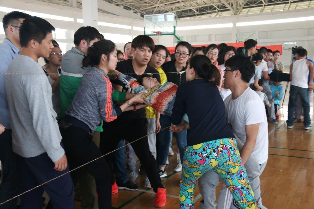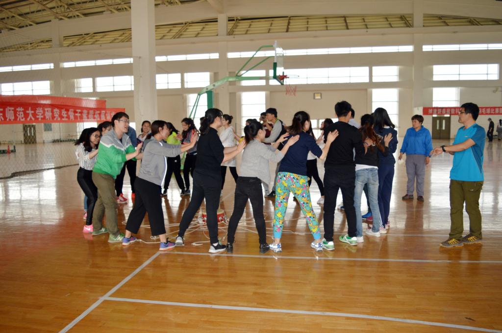 在素质拓展训练正式开始之前,所有参与人员分成了六个小组,分别推选出队长、队秘、旗手,并在5分钟之内设计好队名、队标、队旗、队歌及加油口号。此次训练围绕“团结协作”这一主线,由“智力报数”、“合力颠球”、“激情拍掌”和“穿越生死线”这四个考察团队协作能力的游戏构成,每队必须在规定的时间内完成所有的游戏项目,用时最短者胜出。训练开始后,所有成员积极融入到游戏当中,为了取得团队的胜利每一位成员都拼尽全力,现场气氛紧张而又热烈。尤其是最后的极限挑战项目“穿越生死线”,由于限制条件多,难度也最大,既是对所有参与成员身体极限的残酷考验,同时也是对他们坚韧品质的一个测试。但大家并没有向困难低头,而是注重细节、默契配合、团结协作、永不放弃,当队员们全部成功“穿越生死线”之后,大家都欢呼鼓掌、激动不已。在团队精神的鼓舞下,研究生骨干们完成了所有的考验,展示了校研会成员良好的团队配合能力和大局意识。在每一个游戏完成之后,各小组成员都会交流感受,总结得失,其中这几点得到了大家的普遍认同:一是团队意识,既然是一个团队,就需要不抛弃、不放弃,所有成员真正做到心往一处想,劲往一处使,这样整个团队才有可能成功;二是核心作用,任何一个团队都需要一个领导核心,发挥主心骨的作用,将所有队员团结凝聚在一起,否则只能是一盘散沙;三是珍惜友谊,正如歌词中唱的那样:“相聚是缘,相识是福”,队员们应该珍惜这份共同打拼的缘分,大家不只是学习、工作上的伙伴,更是人生路上的挚友。在训练接近尾声时,校研会主席亓华琛对此次活动进行了总结,分享了他参加本次素质拓展的收获和心得,最后以一首动听的《掌声响起来》送给所有的研究生骨干们。王庆荣在结束仪式上深情地说到:“希望所有人能从今天的训练中深刻领悟到‘熔炼团队,超越自我’的真正内涵,在今后的学习生活及研会工作中满怀一颗团结的心、一颗担当的心,铭记当下,努力创造我们美好的未来。”