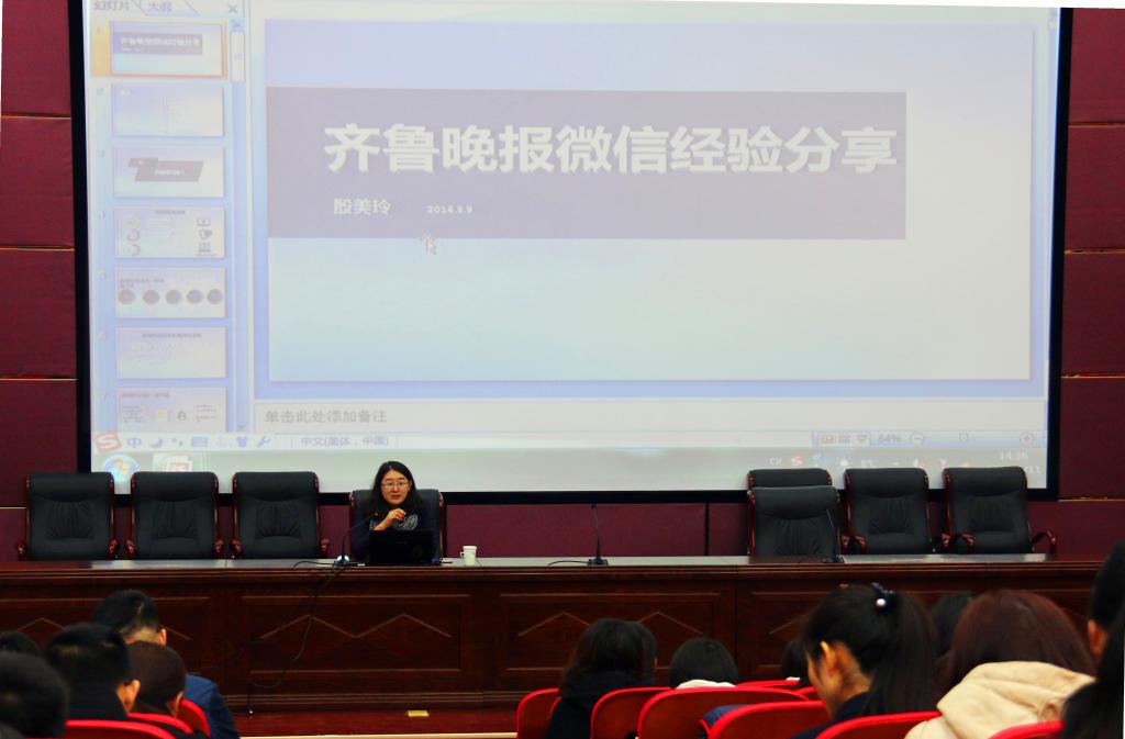 为了顺应新闻发展的新趋势,增强各单位媒体信息的宣传应用能力,于3月11日下午,学校在千佛山校区教学三楼一层报告厅召开研究生骨干培训之新媒体专题培训会,特邀齐鲁晚报新媒体总监殷美玲做了题为《齐鲁晚报微信经验分享》的专题培训。第三十一届校研究生会全体成员、研究生记者团全体成员及各学院研究生宣传骨干等300余人参加本次培训。会议由校研究生会新媒体工作部分管主席周楠主持。