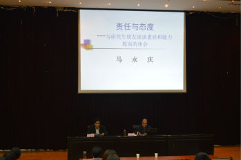 马永庆首先用三个问题作为报告会的开始,并在随后的报告中一一进行阐述。报告会围绕“认识你自己”“我们何以能够承担责任”及“如何履行我们的责任”三个板块展开,深入浅出地告诉我们应如何认识自己,如何实现研究生生活的意义,应承担什么样的责任。整场报告会事例典型鲜明,生动易懂,为研究生明晰自己的定位和目标,圆满完成学业,愉快度过研究生生涯奠定了良好的基础。