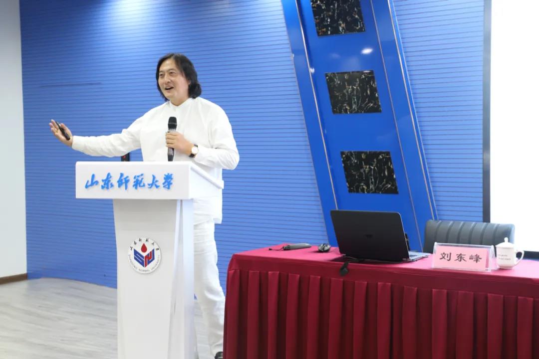刘东峰教授介绍了“艺术设计与视觉传达设计”方面的艺术创作方法。同时,围绕自己参与设计校庆文创产品以及上大学时的亲身观察经历,为大家分享了对文字标语、不同时代海报等方面的体会,认为设计作为一种最直接的介入社会的手段,就是为了解决现实问题。刘东峰讲解生动有趣、诙谐幽默,引发同学们用发散思维思考艺术设计创造的灵感,更好地促进新媒体时代的创新发展。