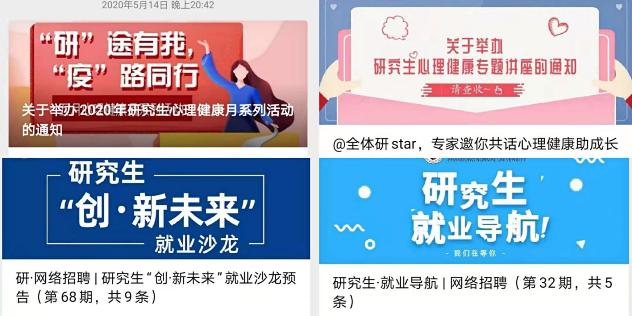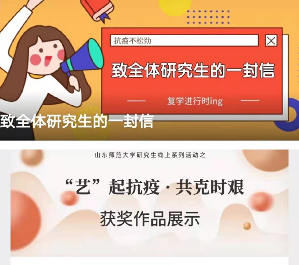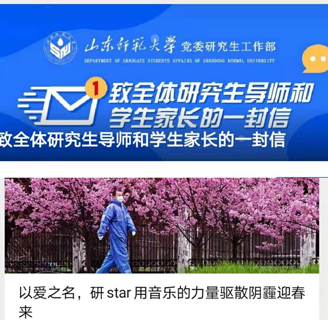 研究生工作部坚持正面宣传引导。配合防疫形势制作各类新媒体作品,倡导学生理性认识疫情,科学做好防护,乐观生活,积极学习。积极挖掘和宣传防疫期间涌现的先进事迹和模范人物,大力加强防疫期间正面舆论引导和研究生思想引领。通过“山东师范大学研究生”微信公众号和部门网站及时发布疫情防控知识、有关要求和学校相关工作安排,研究生微信公众号推送四封“书信”:《<抗击疫情,我们共同倡议>致全体研究生倡议书》《万众一心共命运 率先垂范在行动—山东师范大学研究生党员承诺书》,联合研究院发布《致全体山东师范大学研究生指导教师、研究生和考生的信》《山东师范大学致 2020 届毕业研究生一封信》,抗疫知识宣传文章200余篇,发布抗疫主题原创歌曲1首、原创视频1个,推出“研途无畏,‘疫’起面对”专题,通过网络平台做好研究生主动抗疫、安心学习的教育引导工作。