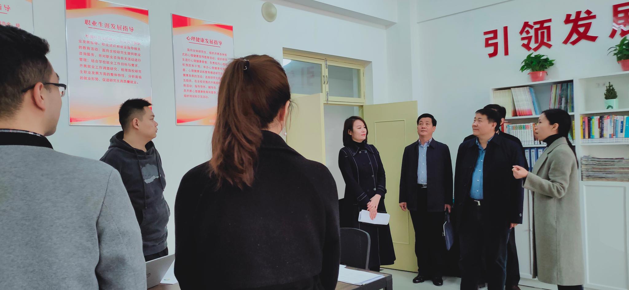 唐洲雁首先来到研究生宿舍,与博士研究生和硕士研究生进行了亲切的交流;随后,实地查看了研究生工作部办公场所、党员初心室、研究生发展研究与指导中心和研究生就业宣讲室,仔细听取了工作人员的介绍,详细查看了相关工作成果。