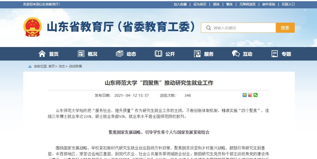 山东师范大学始终把“服务社会,提升质量”作为研究生就业工作的主线,不断创新体制机制,精准实施“四个聚焦”,连续三年博士就业率达100%,硕士就业率超93%,就业率水平居全国师范院校前列。