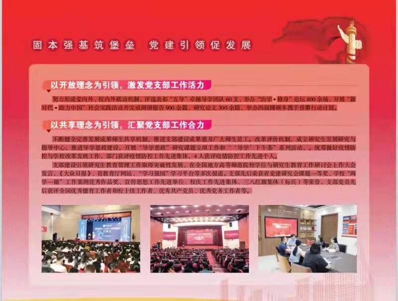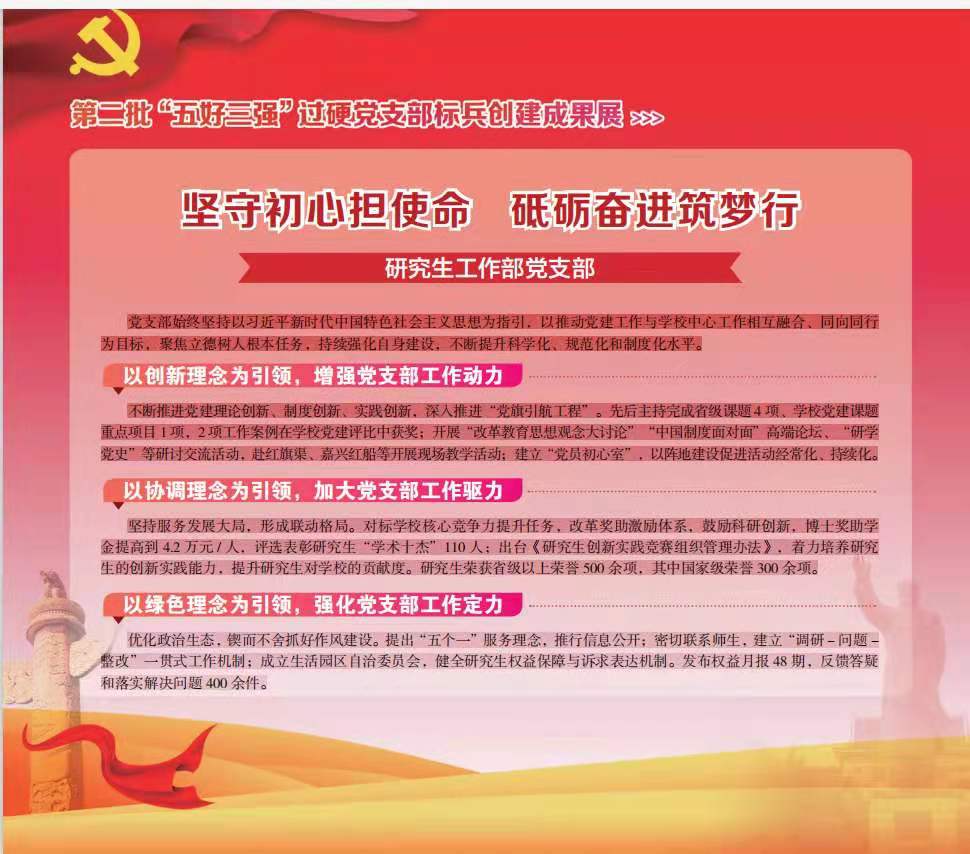 研究生工作部党支部始终坚持以习近平新时代中国特色社会主义思想为指引,以推动党建工作与学校中心工作相互融合、同向同行为目标,聚焦立德树人使命,持续强化自身建设,不断提升科学化、规范化和制度化水平。先后荣获省党建研究会课题一等奖、学校“两学一做”工作案例优秀作品奖、宣传思想工作先进单位、校庆工作先进集体、疫情防控工作先进集体、三八红旗集体(标兵)等荣誉,支部党员先后获评全国优秀德育工作者、校优秀共产党员、优秀党务工作者、十佳工作者、校庆工作先进个人、疫情防控工作先进个人等。